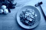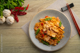 Spicy stir fried instant noodle with sliced pork meat and thai basil leaves in white plate.Top view