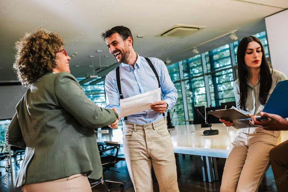 New colleagues meet for the first time. Shaking hands on first day of work. Multiracial group of colleagues.