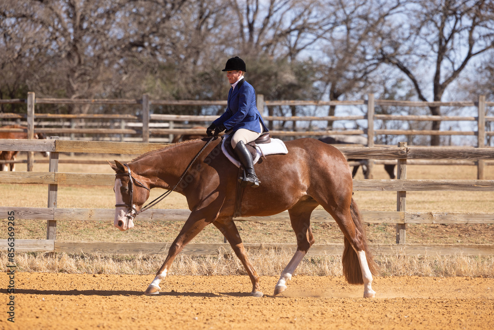Women Equestrian riding in An english Saddle on Paint Horse hunter under saddle