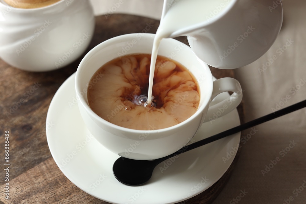 Pouring milk into cup with tea on light table, closeup