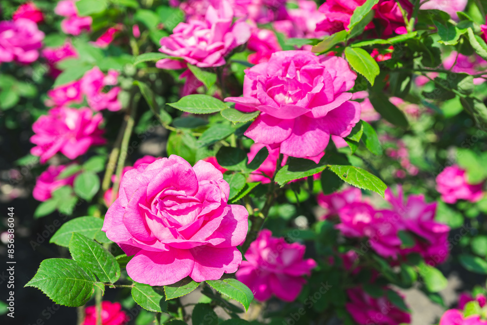 Beautiful blooming rose bush with pink, magenta flowers close up in garden or park, outdoor in sunny day. Breeding and growing roses, gardening, landscape design