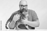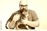 Man holding a scared cat breed Scottish Fold.