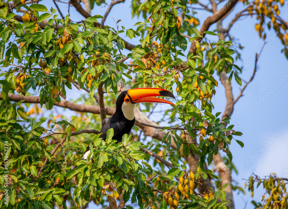 Toco toucan (Ramphastos toco) is sitting on a tree branch. Brazil. Pantanal.