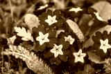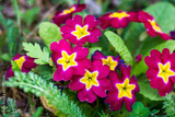 Perennial primrose or primula pink flower with yellow center. Flowers growing in spring garden flower bed. Cultivation, horticulture, gardening.