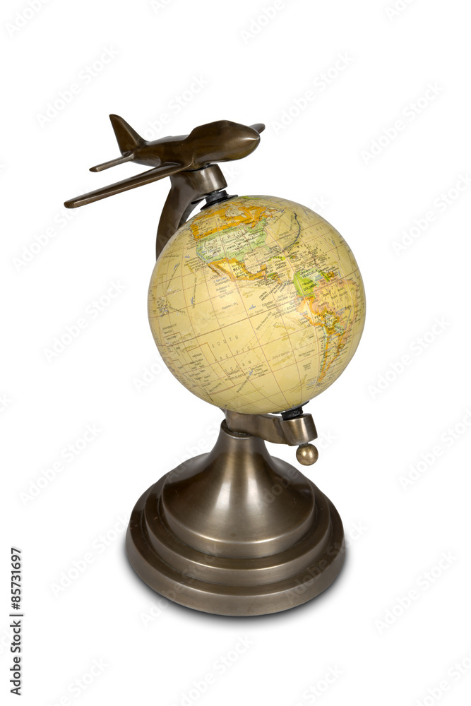 World globe with airplane isolated over white, clipping path included.