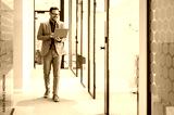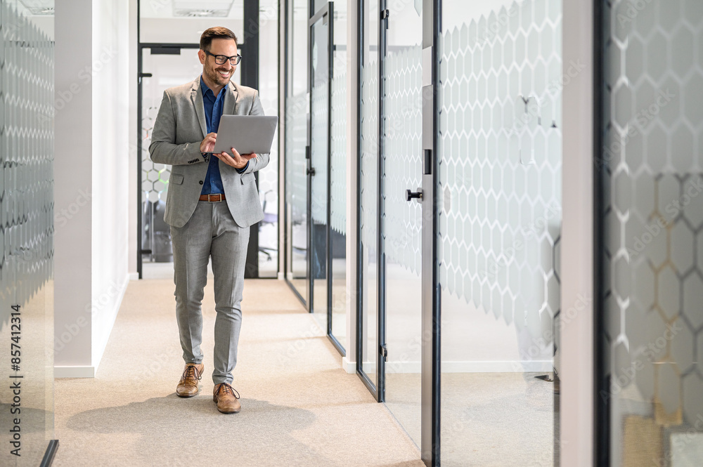Male software developer smiling and doing online research over laptop while walking in office corridor