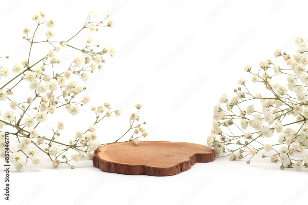 Wooden stump platform podium, flower twig on white background. Minimal empty display product presentation scene.