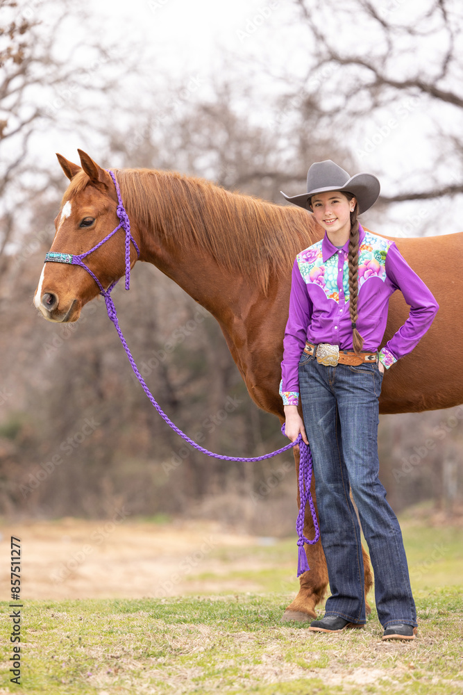 Barrel racer Cowgirl in purple shirt and hat with sorrel Quarter horse