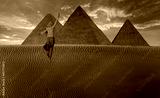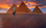 Muslim woman in gray trousers and a scarf jumps on the sands of the Sahara desert - Giza Pyramid Complex at amazing sunset - Cairo, Egypt