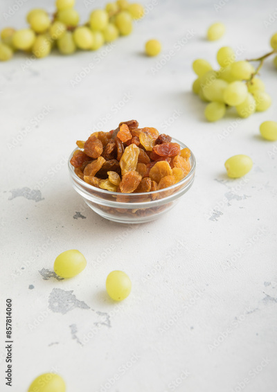 Green sweet dried raisins on light background with ripe grapes.