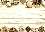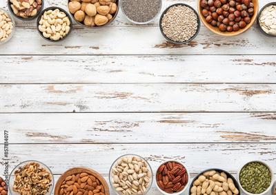 Mixed assorted nuts and seeds in various bowls on white wooden table and space for text in the middle.Top view.
