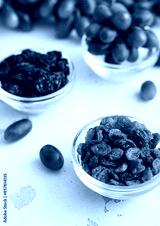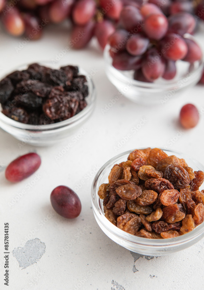 Brown and dark sweet raisins with ripe red grapes on light background.Macro.