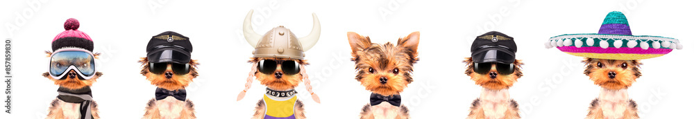 Cute pet in different costumes like teacher, skier, gentlemen, worker and Santa