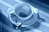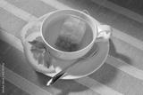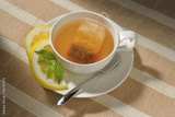 Cup of tea with tea bag and lemon on table