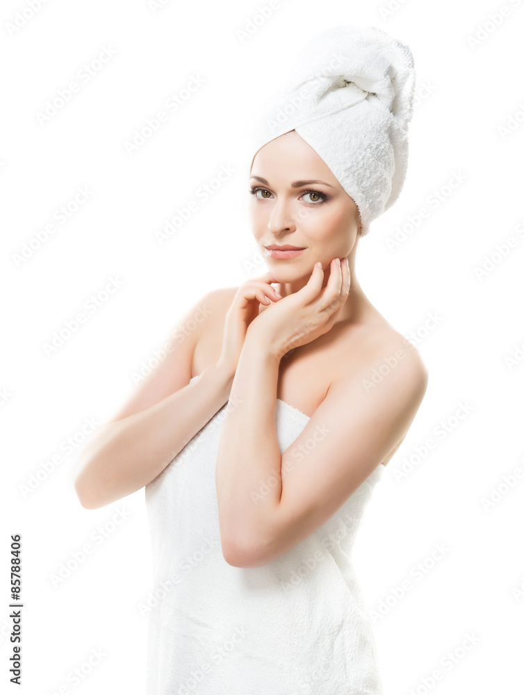 Attractive girl in towel isolated on white. Spa, wellness and health care concept.