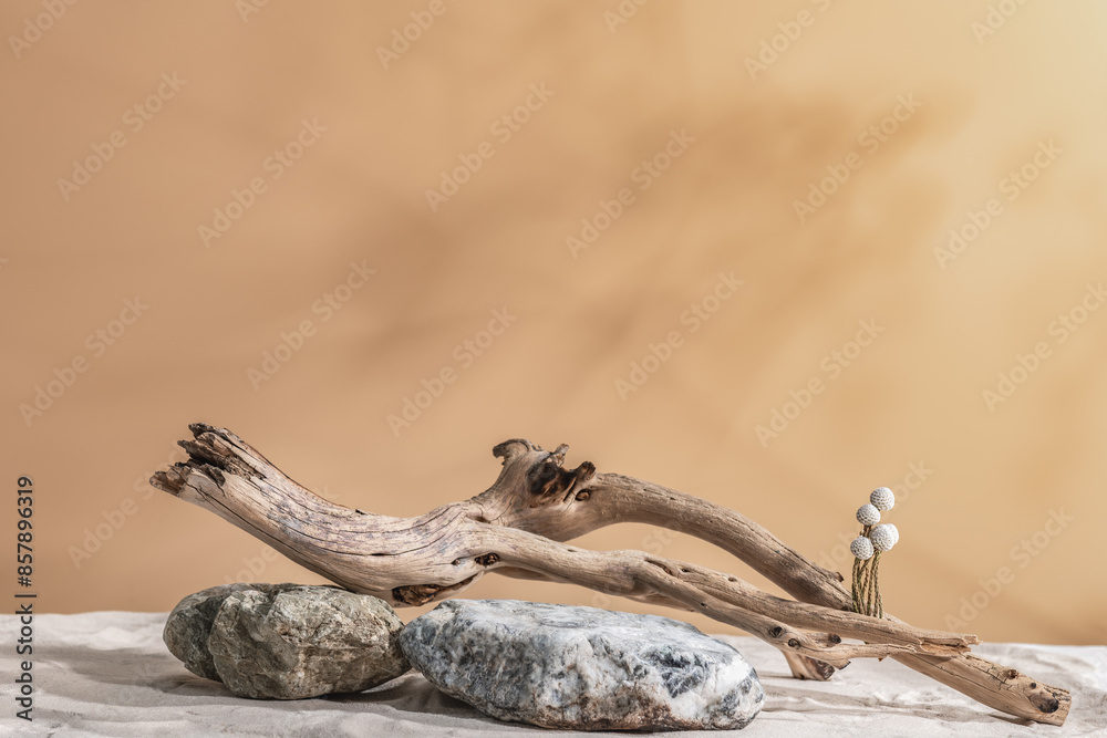 Dry branches, stones, sand and a sprig of brunia. Abstract composition in warm colors, eco-friendly presentation of organic products or cosmetics, selective focus.