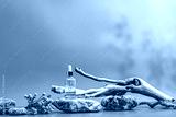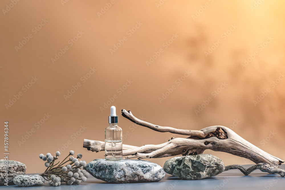 Glass bottle with a pipette with cosmetic essence or serum on a podium among dry branches and stones. Eco-friendly presentation of organic cosmetics
