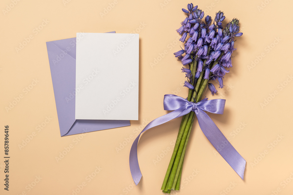 A bouquet of spring Scilla, a lilac envelope and a blank card on a beige background. Greeting card, invitation.