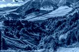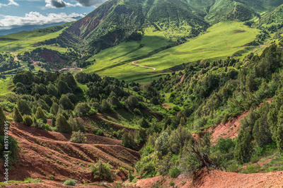 Panorama of a juniper forest in a mountain clay canyon against the backdrop of green mountains.