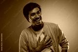 Portrait of young Indian man, radiating genuine joy and warmth in neon light against gradient studio background. Concept of fashion and style, positive human emotions, recreation. Ad