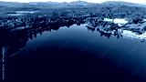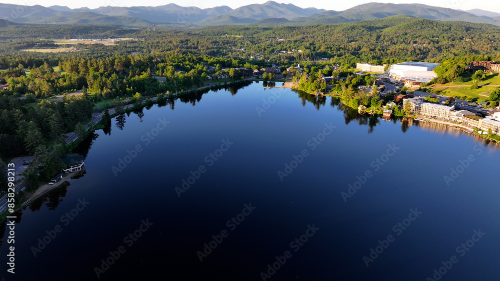 Aerial view of Mirror Lake in Lake Placid, New York in the early morning