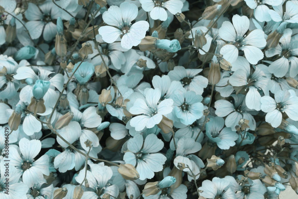 Blue, beige flower bouquet. Nature background.