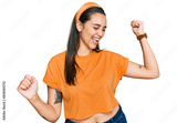 Young hispanic woman wearing casual clothes dancing happy and cheerful, smiling moving casual and confident listening to music