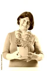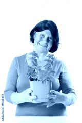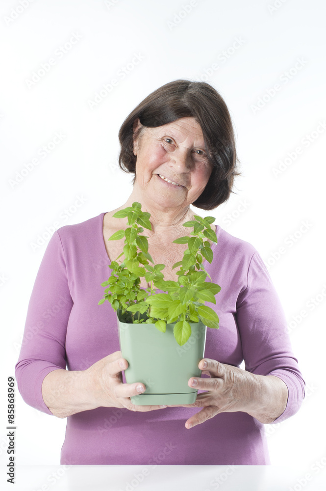 Elderly woman with basil in a pot..
