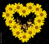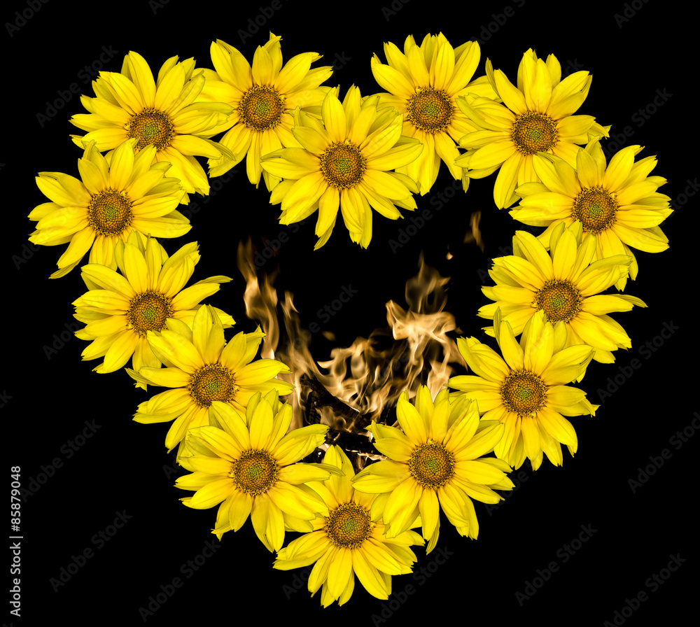 Heart of yellow flowers of decorative sunflowers Helinthus and fire flames inside isolated on black