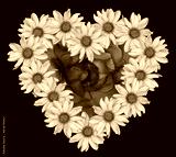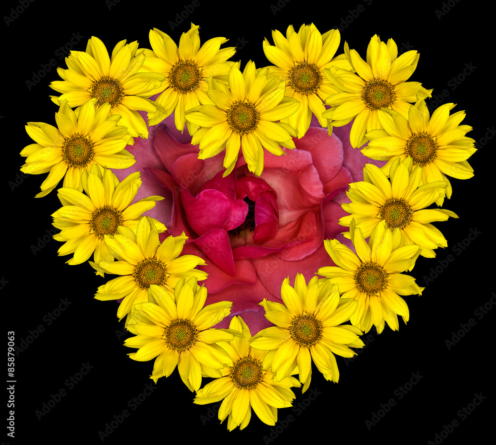 Heart of yellow flowers of decorative sunflowers Helinthus and red rose inside isolated on black
