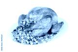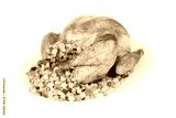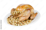 Turkey with Stuffing – A whole roasted turkey on a white platter, surrounded by stuffing. Isolated with clipping path.