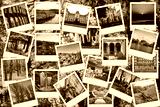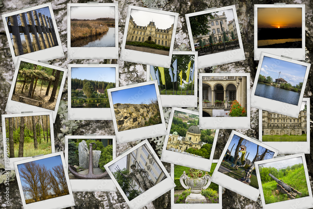 Mosaic collage mix travel with pictures of different places, landscapes and objects shot by myself on texture pine tree bark macro background