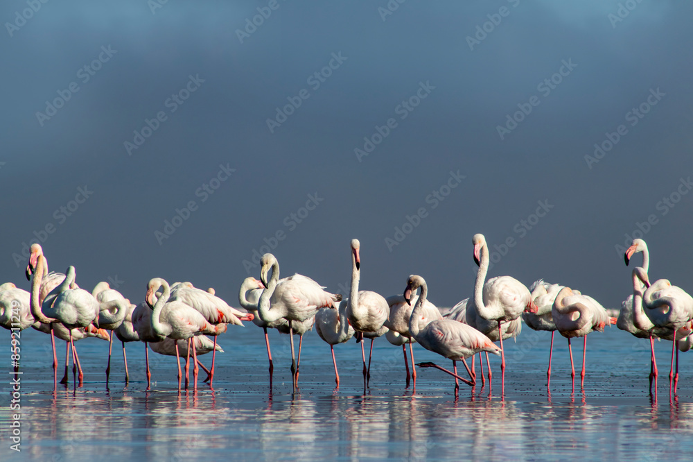African wild birds. A flock of great flamingos on the blue lagoon against the bright sky