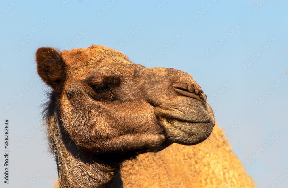 Wild birds. Group of Greater african flamingos walking around the blue lagoon on a sunny day