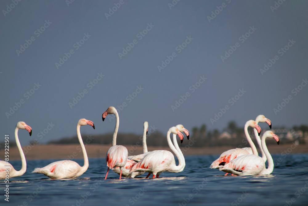 Wild birds. Group of Greater african flamingos walking around the blue lagoon on a sunny day