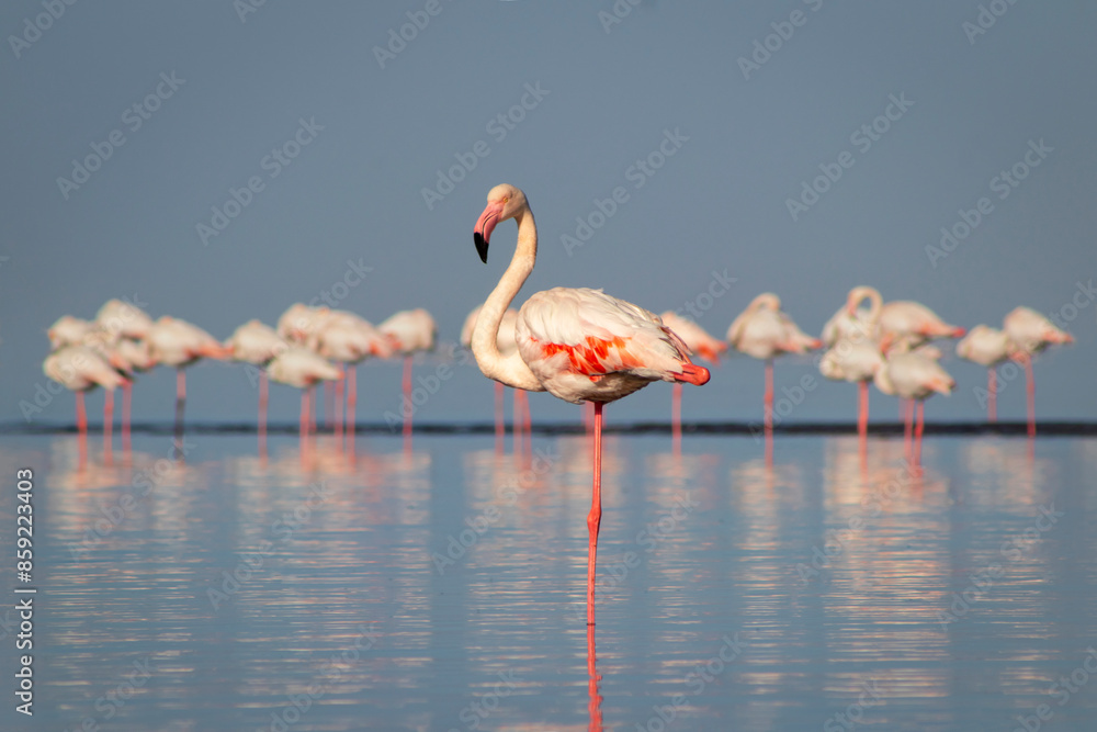 Wild birds. Group of Greater african flamingos walking around the blue lagoon on a sunny day
