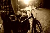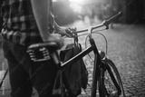 Young man pushing a bike through the city