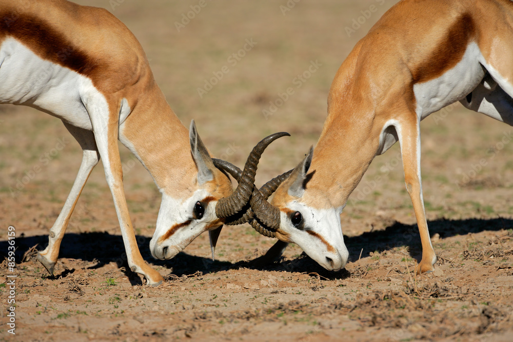 Two male springbok antelopes (Antidorcas marsupialis) fighting for territory, Kalahari desert, South Africa