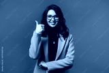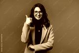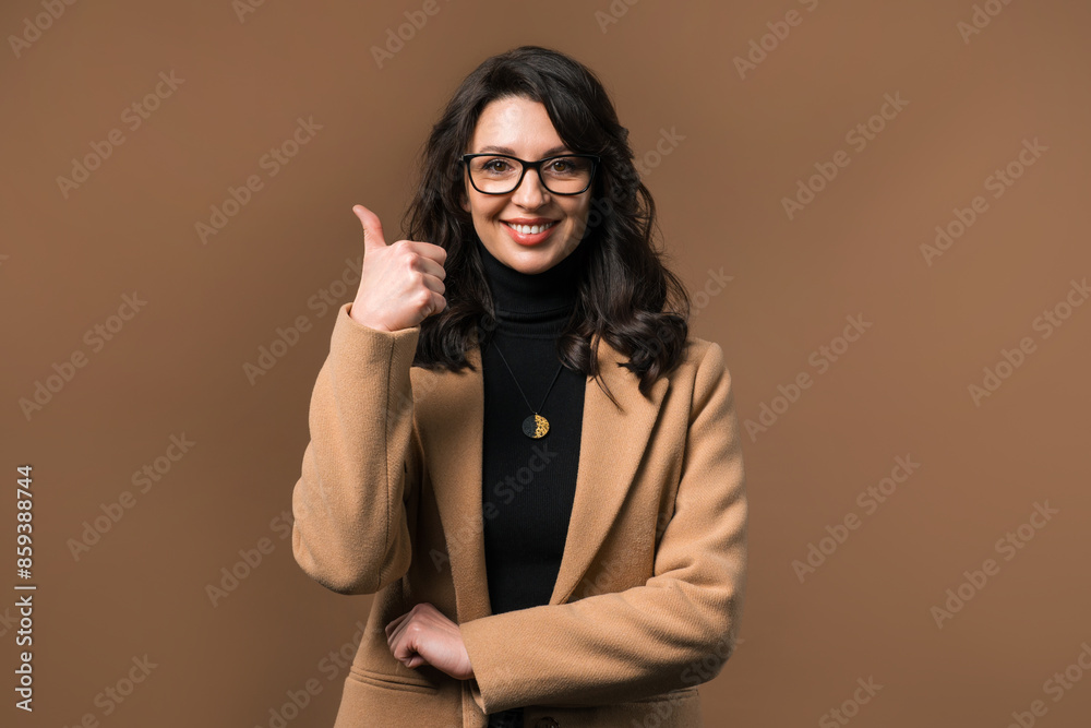 Positive woman with hand sign like, thumbs up gesture. Lady on beige background
