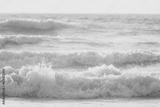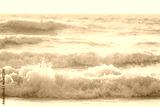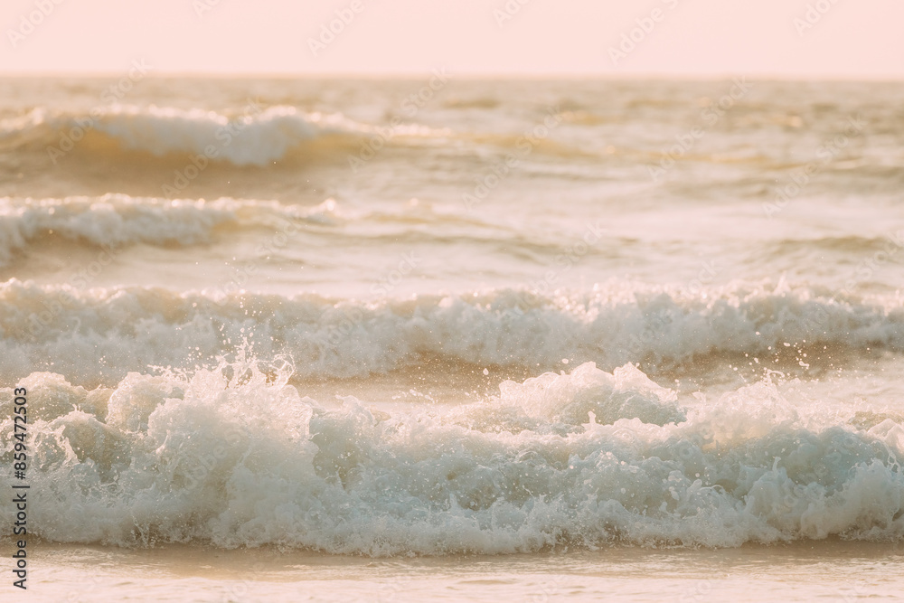 View sea ocean water surface with foaming small waves at sunset. Amazing landscape scenery. Ocean water foam splashes washing sandy beach. Beautiful background. Nature background