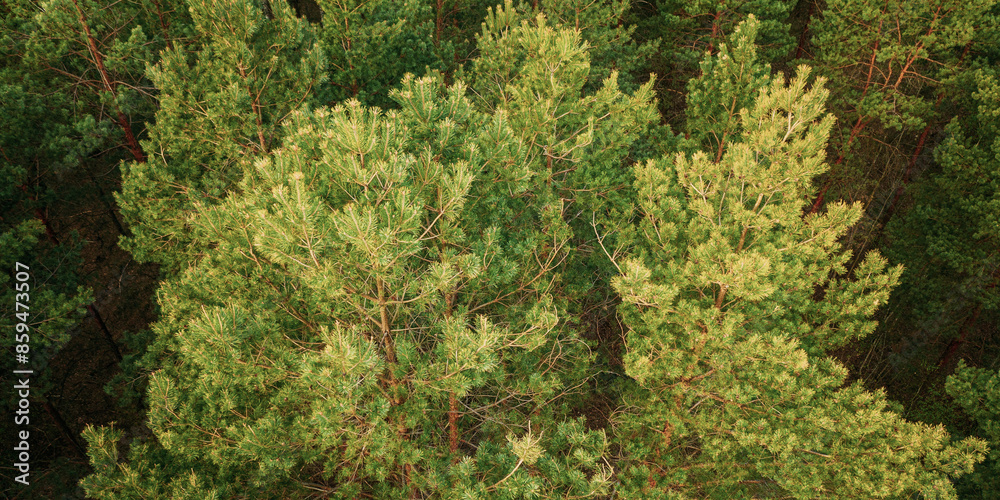 Aerial View Of Green Pine Coniferous Forest In Spring. Top View From Attitude. Drone View Of European Woods At Springtime