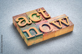 act now - motivational text in retro letterpress wood type stained by color inks, productivity concept