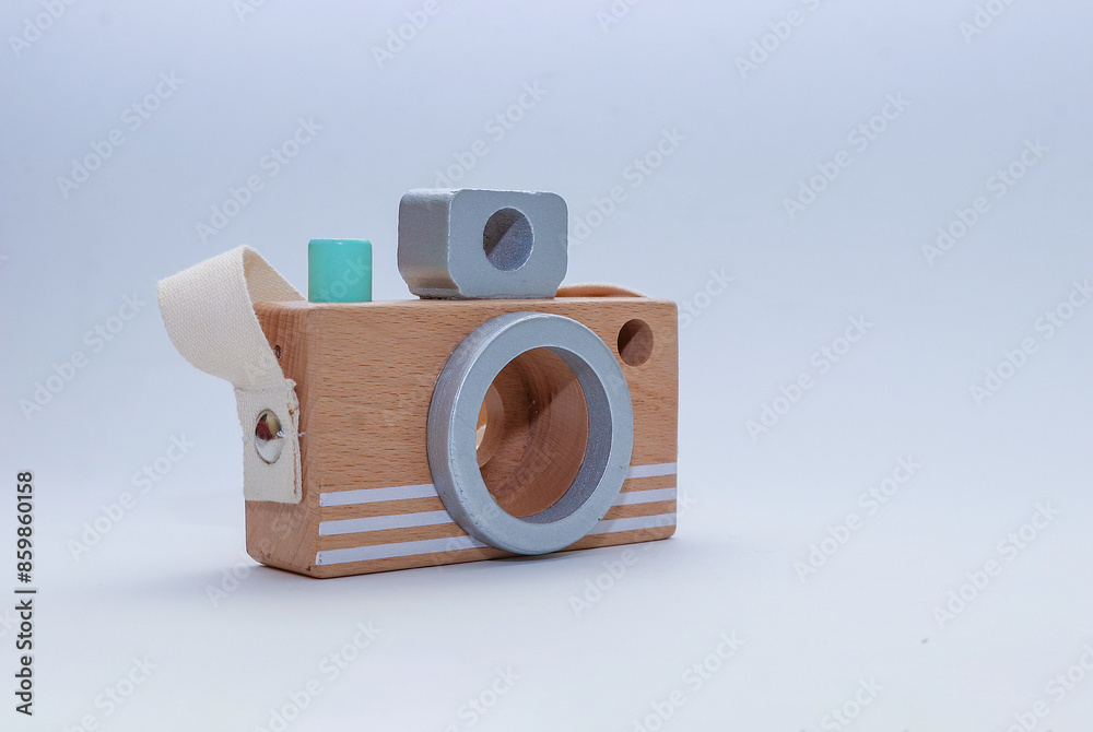 View from above on a wooden children's handmade camera on white paper background with space for text. flat lay