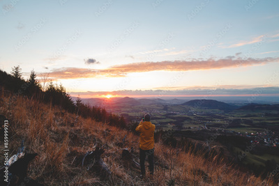 Adventurer takes photos on his mobile phone to capture the sunset. Capturing memories with technology. Beskydy mountains, Czech Republic