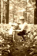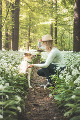 Blonde girl with beige hat teaches her brown and white dog to give paw. A casual portrait of dog and owner in flowered bear garlic. Bond between woman and animal