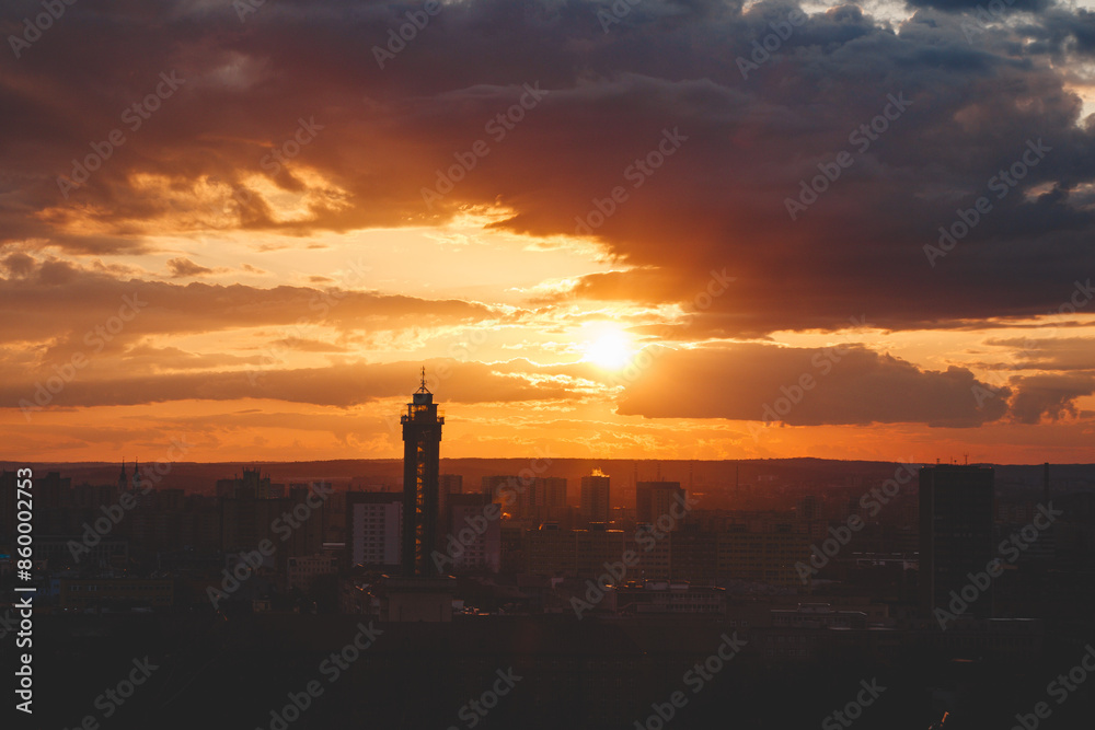Bloody sunset over the industrial city of Ostrava and its centre in the east of the Czech Republic. Sunset over the city