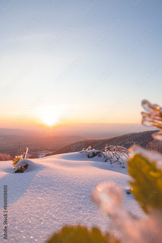 Winter sunset in the Moravian-Silesian Beskids, eastern Czech Republic. Snow-covered peaks, vibrant orange-pink sky, serene nature, and frosted trees create an idyllic, picturesque winter scene