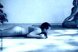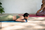 Asian girl with trainer wearing sportswear practicing yoga at home