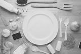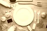 Rural kitchen utensils on wooden table from above - rustic background with free text space,vintage style