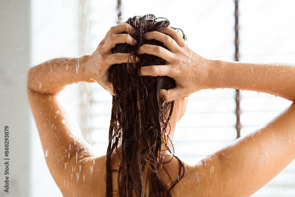 Washing hair. Young woman taking shower, standing under water jet, back view